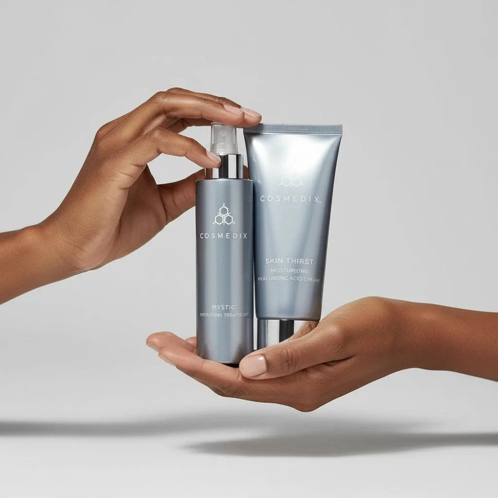 Revitalise your skin with the ultimate hydration duo from CosMedix. Mystic Hydrating Treatment, infused with antioxidants like Witch Hazel and Trehalose, boosts hydration and protects against environmental stressors, leaving your skin refreshed and soothed. Pair it with the Skin Thirst Moisturising Hyaluronic Acid Cream, packed with Hyaluronic Acid and Witch Hazel to lock in moisture and balance oil production. This oil-free cream blurs fine lines and pores, giving you a vibrant complexion. Just apply a small amount after cleansing in the evening for soft, plump skin that's protected from pollution.