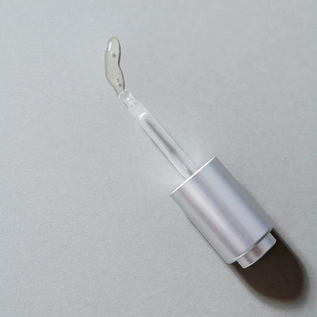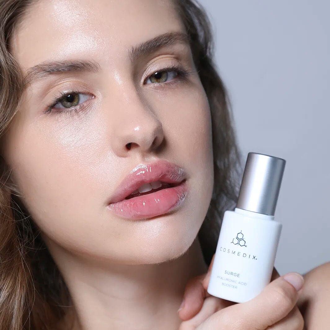 Unscrew Surge’s self-loading cap and press the top of the cap down to dispense a dime-sized amount of the product into hands. Gently pat the serum into the face and neck. Use in the evening.